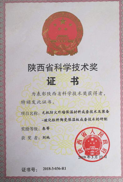“;A咸沾杀匮b飾一體板”是“十二五”國家科技支撐計(jì)劃項(xiàng)目“新型保溫阻燃建筑材料成套技術(shù)研發(fā)與應(yīng)用示范”的科研成果之一,2016年4月17日已經(jīng)由科技部委托住房與城鄉(xiāng)建設(shè)部科技司組織了課題驗(yàn)收。該項(xiàng)目獲得陜西省2018年科學(xué)技術(shù)獎3等獎。