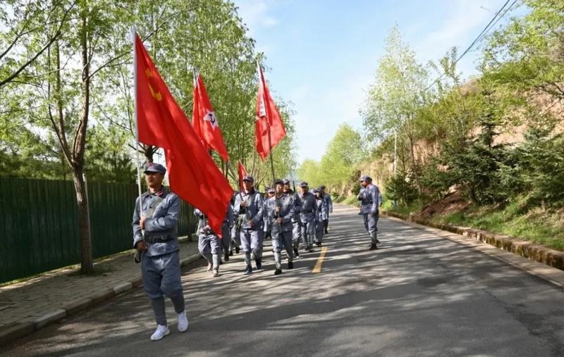 全體黨員懷著激動(dòng)的心情換上紅軍服、佩戴好黨徽,按照長征中紅一、紅二、紅四方面軍的編制分成三隊(duì)依次舉行授旗儀式,在大家齊頌毛主席詩詞《清平樂·六盤山》后,懷著對長征路的憧憬向山頂出發(fā)。