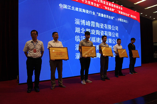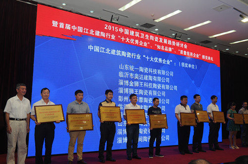 9月5日,2015中國(guó)建筑衛(wèi)生陶瓷發(fā)展趨勢(shì)研討會(huì)暨首屆中國(guó)江北建陶行業(yè)“十大優(yōu)秀企業(yè)”、“知名品牌”、“質(zhì)量信用企業(yè)”頒獎(jiǎng)典禮在淄博市淄川區(qū)人民禮堂召開。本次活動(dòng)由中國(guó)建筑衛(wèi)生陶瓷協(xié)會(huì)陶瓷板分會(huì)、國(guó)家陶瓷及衛(wèi)浴產(chǎn)品中小企業(yè)服務(wù)示范平臺(tái)主辦。中國(guó)建筑衛(wèi)生陶瓷協(xié)會(huì)常務(wù)副會(huì)長(zhǎng)繆斌,秘書長(zhǎng)呂琴,中共淄博市委常委市委政法委書記韓國(guó)祥,淄川區(qū)區(qū)委書記楊洪濤、區(qū)長(zhǎng)李新勝,咸陽(yáng)陶瓷研究設(shè)計(jì)院院長(zhǎng)梁振海及全國(guó)各地建陶產(chǎn)區(qū)企業(yè)代表、專家、學(xué)者和獲獎(jiǎng)單位代表300余人參加了本次研討會(huì)暨頒獎(jiǎng)典禮。 淄博市淄川區(qū)區(qū)委書記楊洪濤為大會(huì)致辭,中國(guó)建筑衛(wèi)生陶瓷協(xié)會(huì)副秘書長(zhǎng)、陶瓷板分會(huì)秘書長(zhǎng)徐波介紹了分會(huì)工作,與會(huì)專家、企業(yè)代表進(jìn)行了交流互動(dòng)。 會(huì)上對(duì)2015首屆中國(guó)江北建筑陶瓷行業(yè)“十大優(yōu)秀企業(yè)”、“知名品牌”、“質(zhì)量信用企業(yè)”進(jìn)行了表彰和頒獎(jiǎng)。山東統(tǒng)一陶瓷科技有限公司、臨沂市奧達(dá)建陶有限公司等10家企業(yè)被評(píng)為2015首屆中國(guó)江北建筑陶瓷行業(yè)“十大優(yōu)秀企業(yè)”,“瓦倫蒂諾”、“米羅印象”等20個(gè)陶瓷品牌被評(píng)為2015首屆中國(guó)江北建筑陶瓷行業(yè)“知名品牌”,淄博獅王陶瓷有限公司、沈陽(yáng)新王者陶瓷有限公司等20家企業(yè)被評(píng)為2015首屆中國(guó)江北建筑陶瓷行業(yè)“質(zhì)量信用企業(yè)”。 (獲獎(jiǎng)企業(yè)名單見附件)